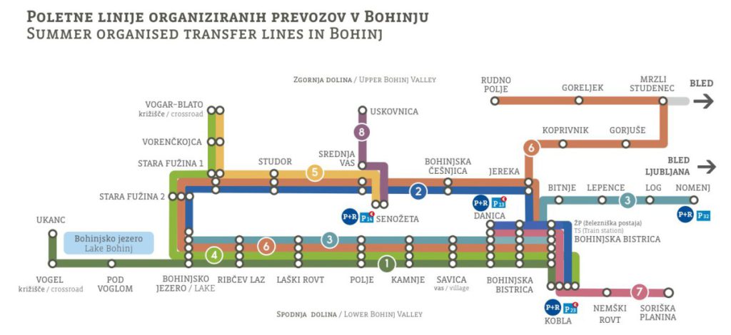 Vse informacije o trenutnih možnostih javnih prevozov, organiziranih linijah in parkiranju najdete na https://promet.bohinj.si/.